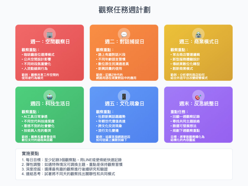 觀察的深度比廣度更重要。與其泛泛地觀察一切,不如選擇幾個特定的領域進行深度觀察。我選擇了三個主要的觀察領域:數位行為變化、消費模式演變、跨世代價值觀差異。在這些領域中,我建立了完整的觀察框架,積累了大量的案例和數據。