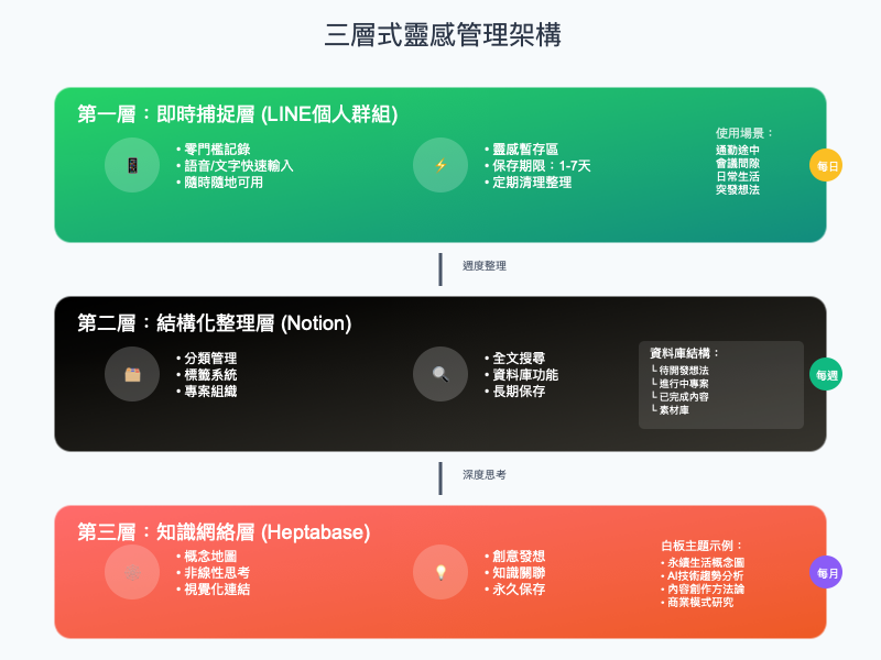 經過多年的實踐和調整,我發展出一套三層式的靈感管理架構。這個架構的設計理念是經過層次化處理,不同層次有不同的功能和時間週期,確保每個想法都能在最適合的層次得到最恰當的處理。